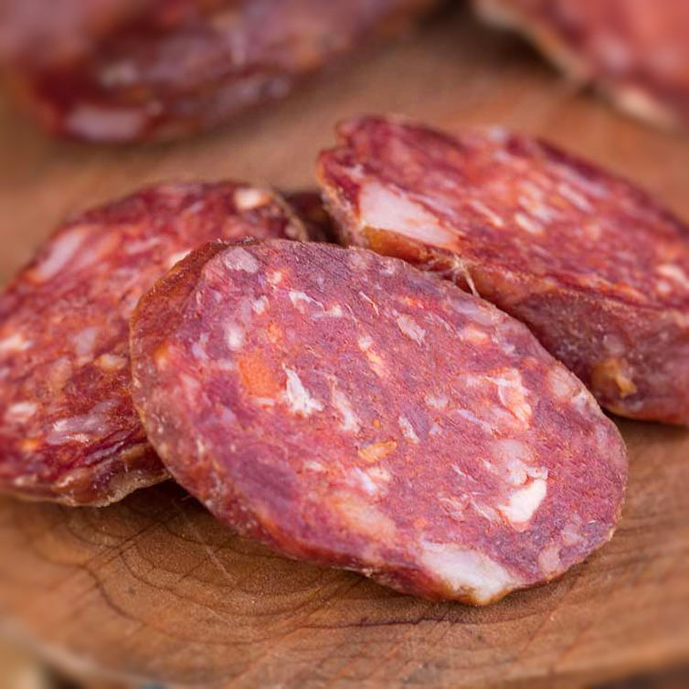 La Salsiccia Secca di Bufalo Campano è un alimento dal gusto vivace e sorprendente. Prodotto con il macinato di Bufalo Campano dei nostri allevamenti, che sia dolce o piccante è sempre in grado di comunicare tutto il sapore di un alimento naturale e genuino. Viene aromatizzata con semi di finocchio ed essiccata accuratamente. Per il piccante invece è utilizzato esclusivamente peperoncino calabrese. La Salsiccia Secca di Bufalo Campano può essere utilizzata per comporre piatti sfiziosi e sorprendenti.